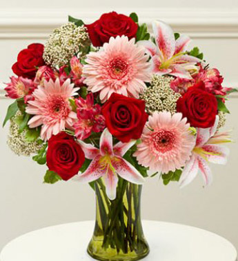 A beautiful arrangement of roses, Gerberas, lilies, alstroemeria and rice flowers expresses your deepest sentiments during difficult times of sorrow. Our florists use only the freshest flowers available so colours and varieties may vary. Vase included.