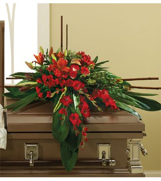 Honor someone who was truly loved with this beautiful casket spray. Filled with long stem red roses, red sweet pea, red lilies and more. Our florist's hand-design each arrangement, so colors, varieties, and containers may vary due to local availability.