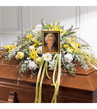 Casket spray designed to hold a frame. Made with an assortment of yellow and white flowers and long flowing ribbons.