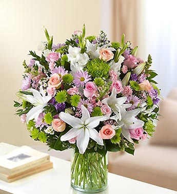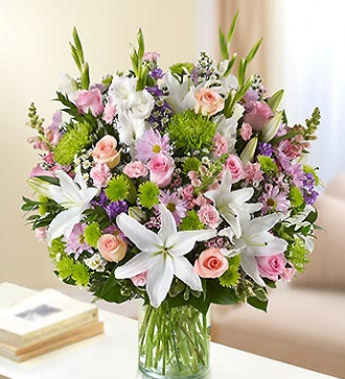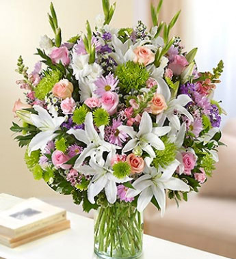 Remember a loved one who has passed on with this stunning tribute arrangement. The elegance of pastel-coloured roses, lilies, gladiolas, stock, snapdragons and more offers your heartfelt memories of a beautiful life. Premium measures approximately 24"H x 22"W. Deluxe measures approximately 22"H x 20"W. Standard measures approximately 20"H x 18"W. Can be sent to the home of friends, family members or business associates, or to the funeral service. Our florists use only the freshest flowers available so varieties, shades and containers may vary.
