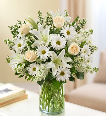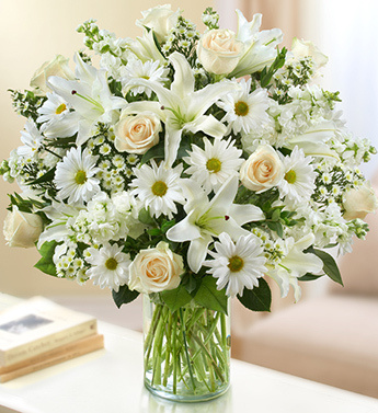 Express your sincere condolences with this elegant all-white arrangement of roses, lilies, stock, daisy poms and monte casino in a classic glass vase. A peaceful tribute that offers treasured memories of loved ones. Premium measures approximately 24"H x 22"W. Deluxe measures approximately 22"H x 20"W. Standard measures approximately 20"H x 18"W. Can be sent to the home of friends, family members or business associates, or to the funeral service. Our florists use only the freshest flowers available so varieties, shades and containers may vary.