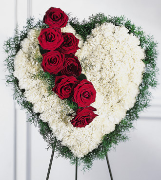 This heart shaped arrangement expresses their grief over a loss. Red roses and white carnations are arranged and placed on an easel for display in a funeral home or service.
