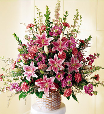 The FTD Leaf & Petals Basket is a gorgeous arrangement of blushing grace to commemorate the life of the departed. Pink carnations, pink larkspur, lavender stock, Stargazer Lilies, lavender daisies and a variety of lush greens are exquisitely arranged in a white-wash basket to create a lovely way to convey your sympathies and offer caring kindness to those grieving their loss. An appropriate gift for family, friends and business associates to send directly to the funeral home. Our florists use only the freshest flowers available so colors, container styles and varieties may vary.