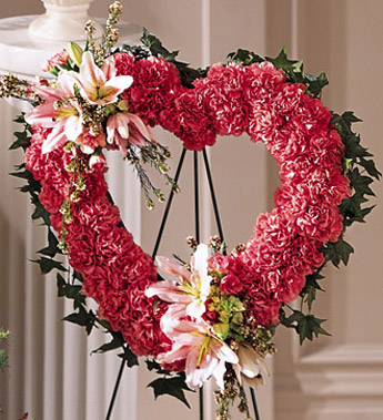 The FTD® Our Love Eternal™ Heart is a stunning tribute to the everlasting bond you will always share. Pink carnations are arranged in the shape of a heart accented with clusters of pink Oriental Lilies and blush hydreangea to bring beauty and grace to their final farewell. An appropriate gift to send directly to the funeral home or service. Our florists use only the freshest flowers available so colors and varieties may vary.
