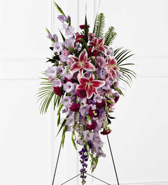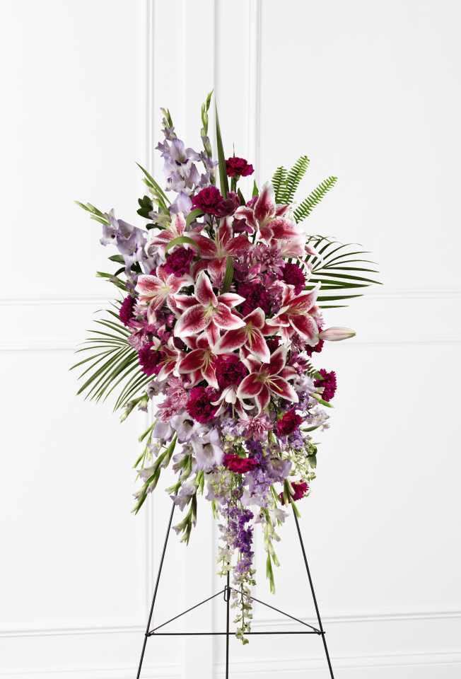 The FTD Tender Touch Standing Spray creates an elegant display of beauty and color to enhance their final tribute. Lavender gladiolus, Stargazer lilies, fuchsia carnations, purple larkspur, lavender Peruvian lilies, lavender chrysanthemums, sword fern fronds, emerald palm fronds and other assorted greens are gorgeously arranged to create a sophisticated standing spray. Displayed on a wire easel, this arrangement will add to the sophistication of their service with each fragrant bloom. An appropriate gift to send directly to the funeral home or service. Our florists use only the freshest flowers available so colors and varieties may vary.