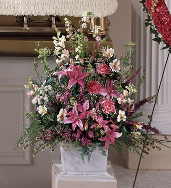 Pink lilies, larkspur, snapdragons, and heather are arranged in this splendid display accented with white blooms and lush greens. An appropriate gift to send to a family home or directly to the funeral home. Our florists use only the freshest flowers available so colors, varieties and containers may vary.