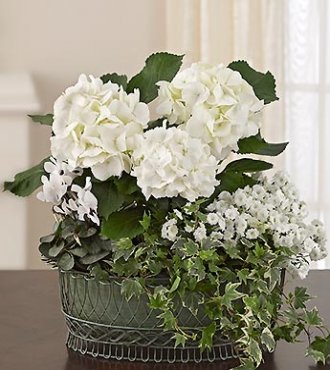 Fill their day with the serene beauty of this classic indoor garden. Crisp white hydrangeas, campanula and cyclamen are gathered together with beautiful greens to create a truly elegant gift. Plant variety and container style may vary due to local availability.